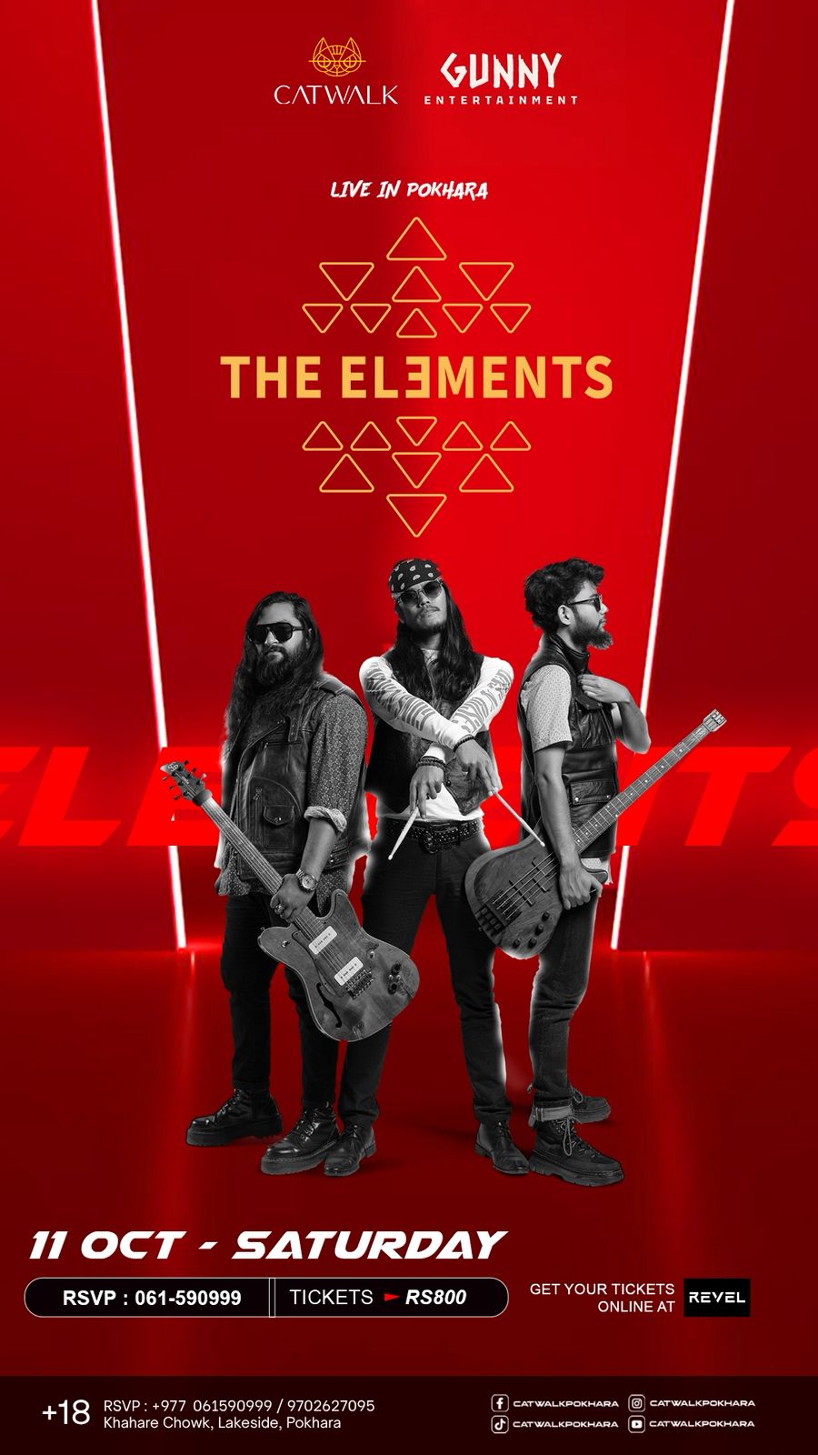 The Elements will be performing live at Club Catwalk, Pokhara on Saturday, October 11, 2025. The event runs from 10:00 PM to 2:00 AM, promising a night filled with vibrant music, energetic vibes, and unforgettable memories. Tickets are priced at Rs. 800 to Rs. 1,000. The event is organized by Gunny Entertainment and is expected to draw crowds eager to experience the legendary band's electrifying performance.
